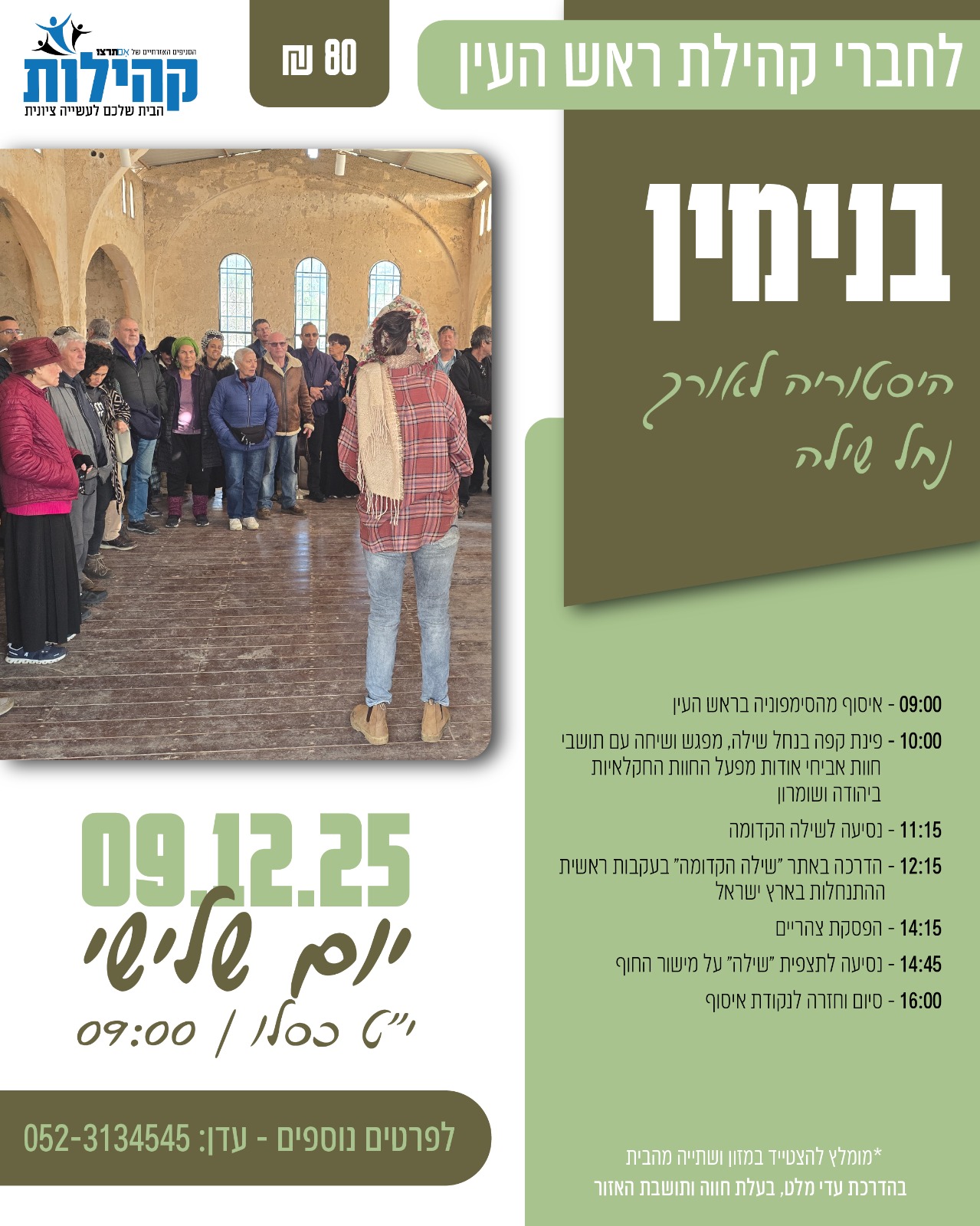 לחברי קהילת ראש העין בלו״ז: 09:00 – איסוף מהסימפוניה בראש העין 10:00 – פינת קפה בנחל שילה, מפגש ושיחה עם תושבי חוות אביחי אודות מפעל