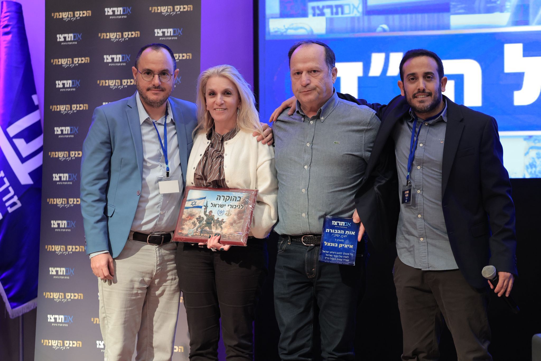 רגע מרגש במיוחד היה הענקת אות ההוקרה לאיציק ונועה בונצל, הוריו של גיבור ישראל, סמ"ר עמית בונצל הי"ד, שנפל בקרב בעזה בדצמבר 2023. איציק בונצל קרא מעל הבמה להנהגת המדינה: