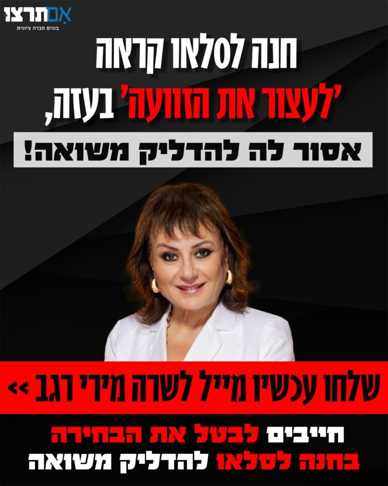 שלחו עכשיו מייל לשרה מירי רגב: לבטל את הבחירה בחנה לסלאו להדליק משואה! אנחנו לא נסכים לקבל שמי שחתמה על עצומה שקוראת 'לעצור את הזוועה'