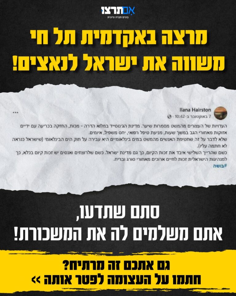 המרצה שמשווה את ישראל לרייך השלישי, לא יכולה להישאר בלימודים! ד"ר אילנה הירסטון השוותה בין ישראל לנאצים, היא מלמדת במכללת תל חי, אסור שהיא תמשיך