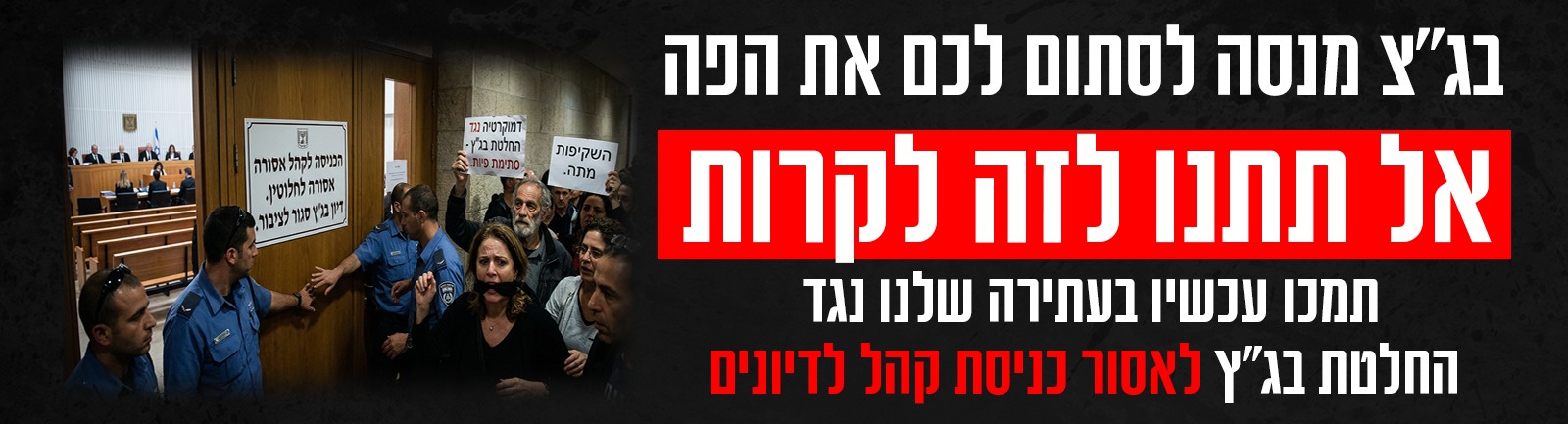 חברים יקרים, בג"ץ מנסה להשתיק את עם ישראל ואנחנו צריכים אתכם! שופטי בג"ץ קיבלו החלטה הזויה לא להכניס קהל לדיונים ע"פ שיקול דעתם. החלטה מופקרת נגד החוק! הם עושים את זה כי הם חוששים להתבזות מול עם ישראל. הם יודעים היטב שהם מיעוט הולך ונעלם והם לא מוכנים לשמוע ביקורת. אנחנו לא נסכים שישתיקו את קול העם. אנחנו עותרים לבג"ץ כדי למנוע מהם להשתיק אותנו. הם ישמעו, ועוד איך ישמעו את הביקורת הציבורית שיש לעם ישראל נגד ההחלטות הבזויות שלהם. לשם העתירה אנו זקוקים לסכום של 25,000 וצריכים את תמיכתכם. תרמו עכשיו כדי שחופש הביטוי ינצח את הדיקטטורים בבג"ץ.